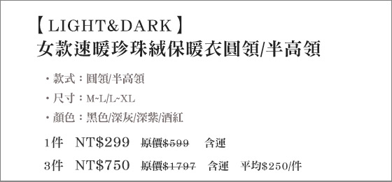 LIGHT&DARK-女款速暖珍珠絨保暖衣圓領/半高領"團購,LIGHT&DARK-女款速暖珍珠絨保暖衣圓領/半高領"上班這黨事,